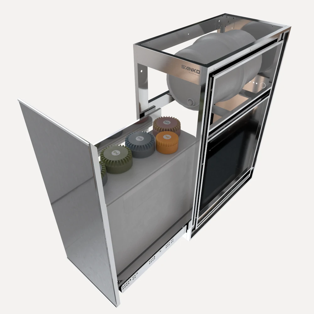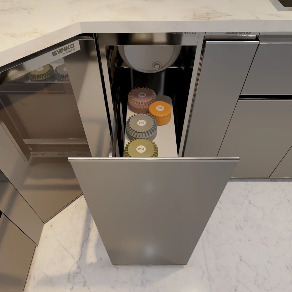 Sản phẩm C300WR khẳng định năng lực thiết kế của nhà máy Sanko. Việc sắp xếp thành công hệ thống RO phức tạp vào một khoảng không gian bề ngang vỏn vẹn 30cm đòi hỏi độ dung sai cơ khí khi chấn gấp Inox bằng máy CNC phải chính xác đến từng milimet. Tủ bếp Inox Sanko không chỉ bền bỉ mà còn mang trong mình những module chức năng phục vụ cho người sử dụng.