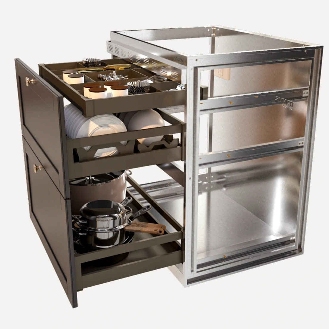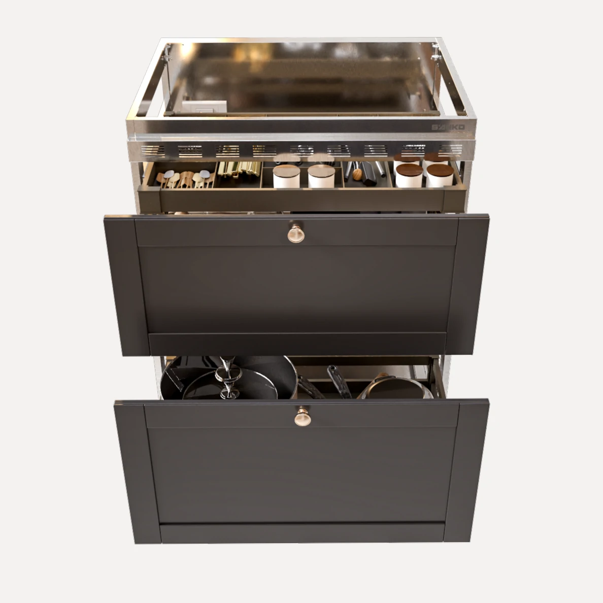 - Chuỗi thao tác nấu nướng hoàn hảo: Người nấu chỉ cần đứng tại một vị trí duy nhất. Kéo ngăn trên cùng lấy đũa/muỗng để xào nấu. Kéo ngăn giữa lấy đĩa để bày thức ăn nóng. Kéo ngăn dưới cùng để cất/lấy xoong nồi. Mọi vật dụng đều bày ra trước mắt, không cần khom lưng tìm kiếm.