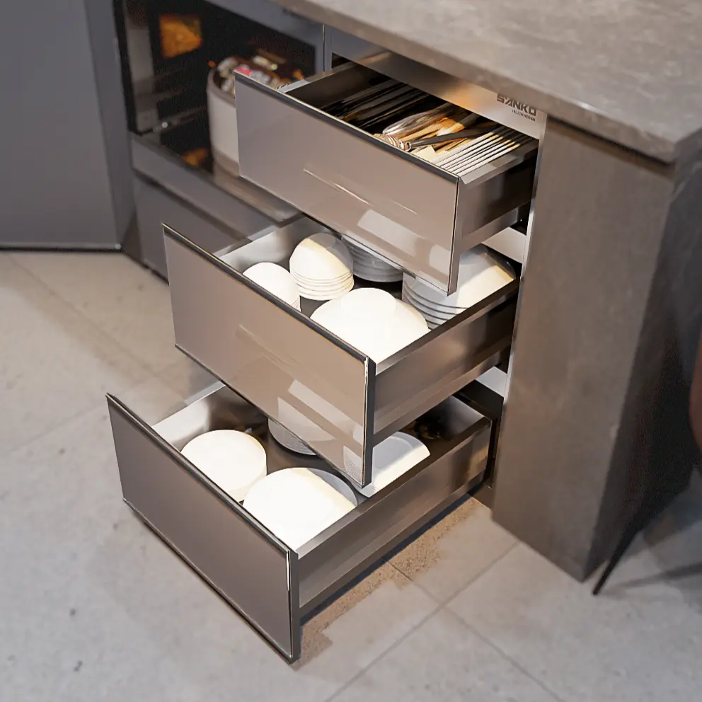 - Thao tác linh hoạt: Thay vì phải cúi người và với tay vào sâu trong hộc tủ tối tăm để lấy chiếc đĩa trong cùng, bạn chỉ cần kéo nhẹ ngăn kéo. Toàn bộ bát đĩa sẽ “trượt” ra trước mắt, giúp việc lấy/cất diễn ra trong 1 giây.