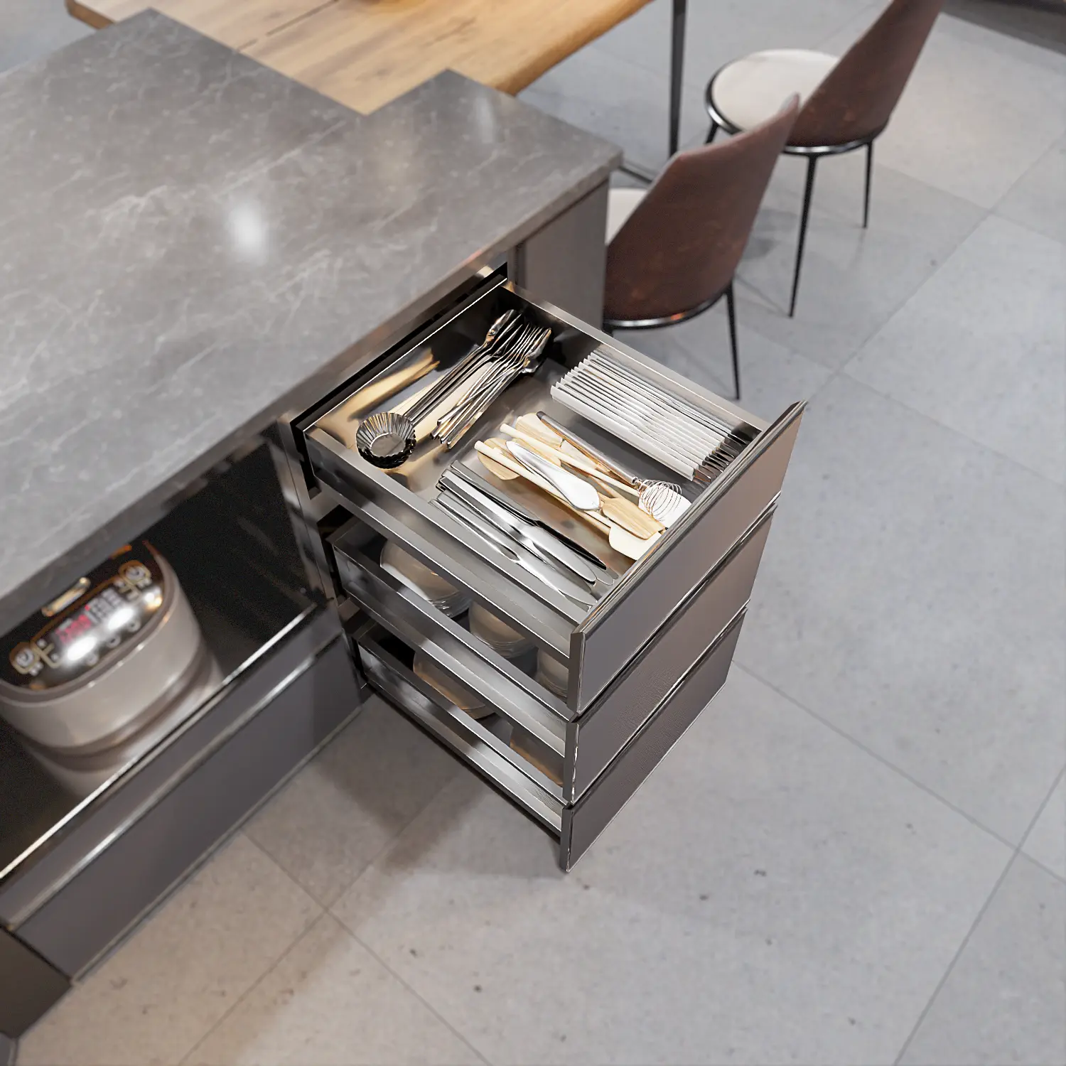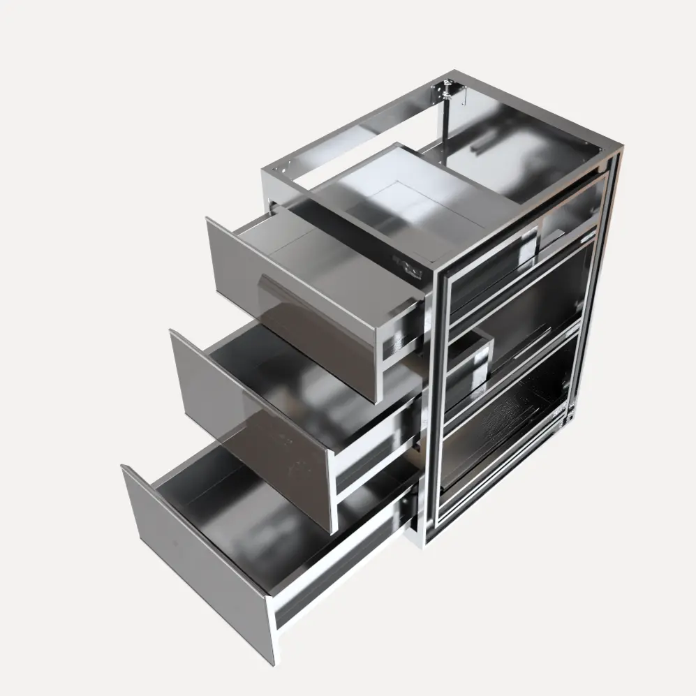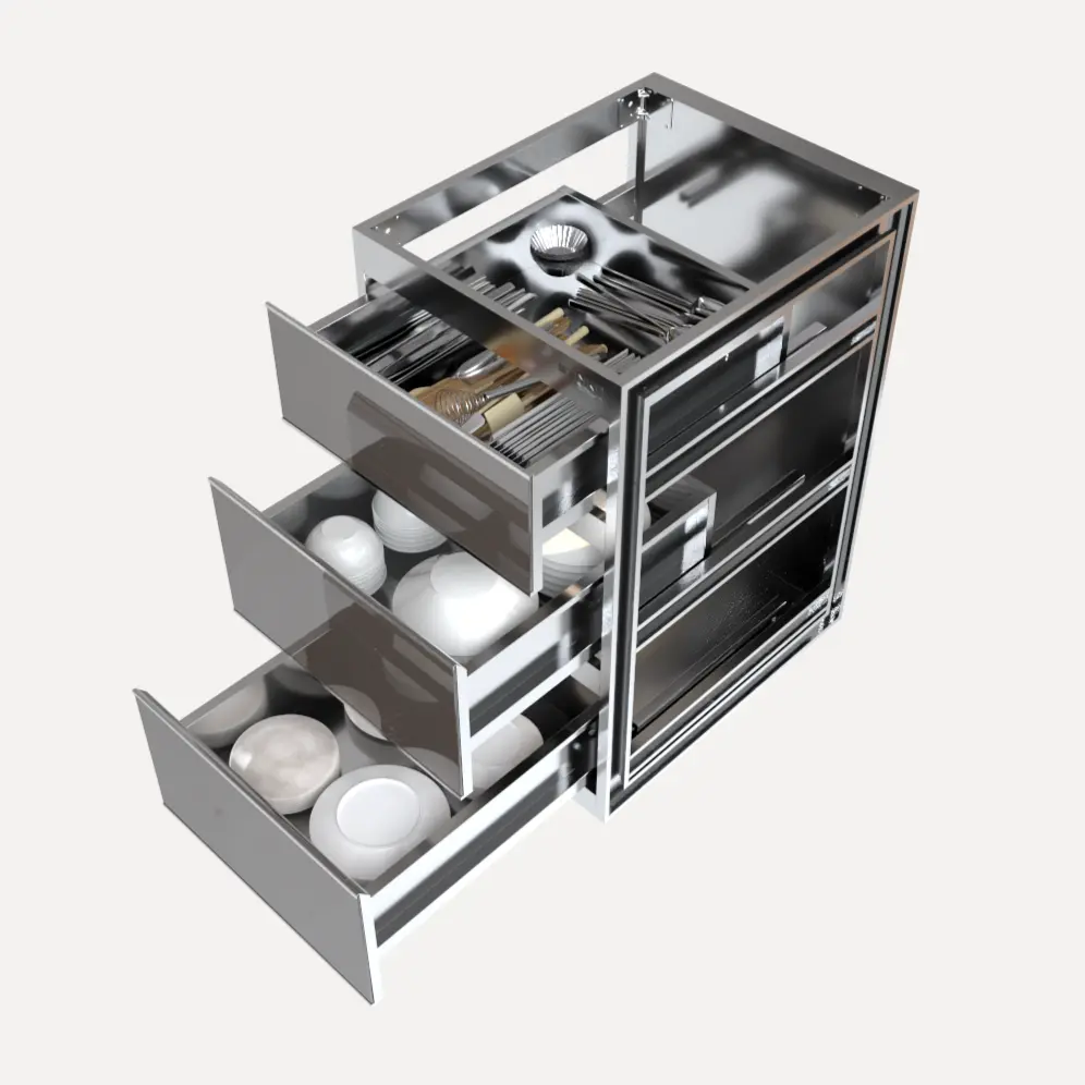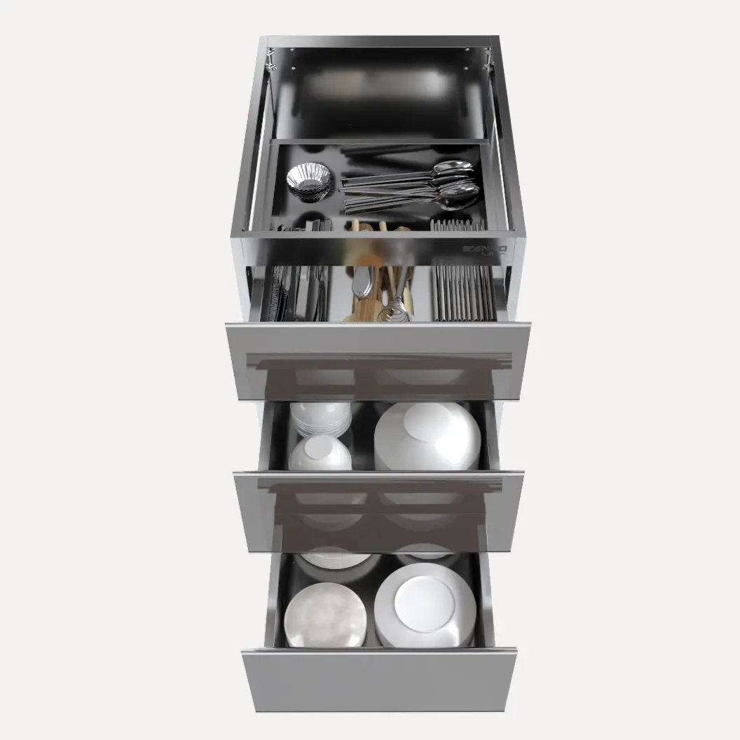 Tủ chén đĩa C450CD sử dụng kết cấu 3 ngăn kéo inox 304 thay vì cánh mở truyền thống. Điểm thông minh nằm ở sự phân chia chiều cao lọt lòng của từng ngăn để phù hợp với các loại bát đĩa khác nhau: