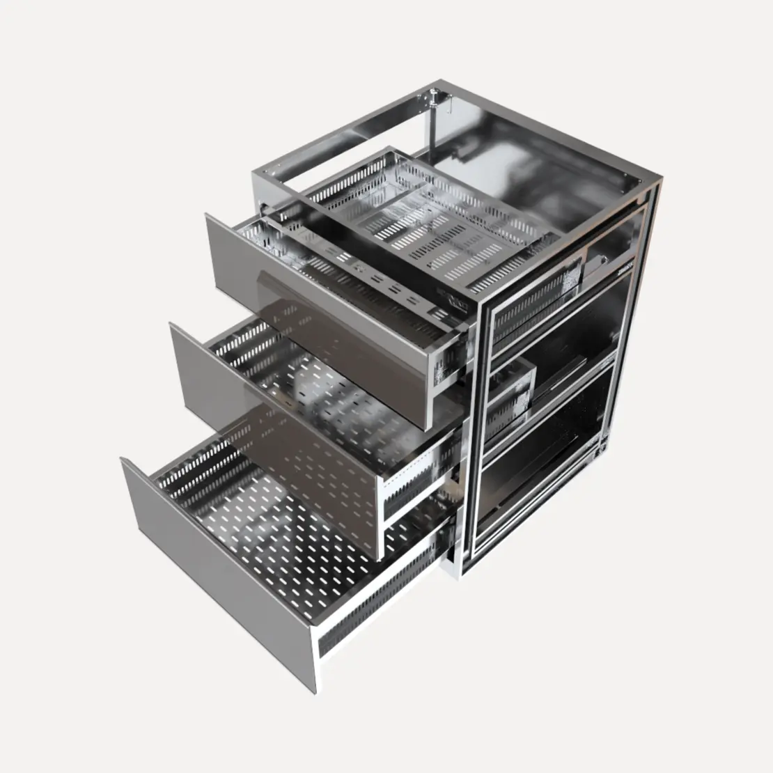 - Hệ thống lỗ thoát hơi: Khác với tủ kín thông thường, các mặt ngăn kéo của C600CD được gia công dập lỗ. Cấu tạo này tạo ra sự đối lưu không khí, giúp hơi ẩm từ bát đĩa (nếu còn sót lại) thoát ra ngoài dễ dàng, ngăn chặn vi khuẩn và mùi hôi phát sinh trong môi trường kín.