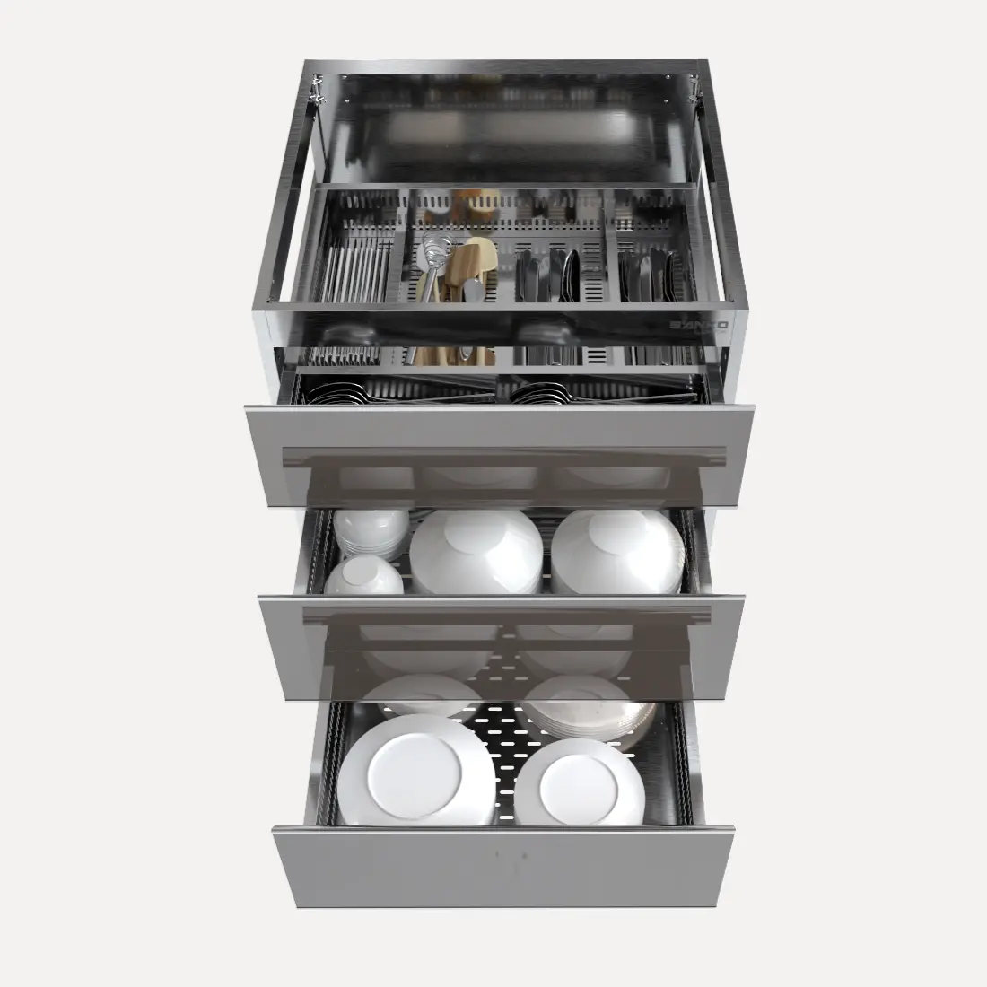 Module inox 304 C600CD có cấu tạo gồm 3 ngăn kéo chuyên dụng được thiết kế để tối ưu chức năng lưu trữ chén đĩa, thìa đũa và các dụng cụ nhà bếp. Mỗi ngăn kéo được bố trí khoa học, có rãnh thoát hơi giúp chén đĩa luôn khô thoáng. Việc thay đổi cấu tạo (như thay đổi số lượng ngăn, thiết kế ray, bố trí thoát hơi…) có thể làm ảnh hưởng đến công năng sử dụng, độ bền và hiệu quả của tủ. Vì vậy, Sanko khuyến nghị giữ nguyên cấu trúc tiêu chuẩn để đảm bảo hiệu quả lưu trữ và thời gian sử dụng lâu dài. Tuy nhiên, nếu khách hàng có yêu cầu đặc biệt, Sanko sẽ phối hợp tư vấn kỹ thuật để cân nhắc giải pháp phù hợp.