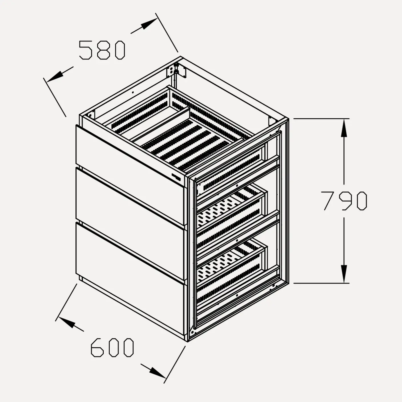 Tủ chén đĩa C600CD được thiết kế theo tiêu chuẩn module, tối ưu cho việc lưu trữ và sắp xếp chén đĩa – dụng cụ ăn uống trong khoang tủ bếp dưới. Cấu tạo chi tiết gồm: