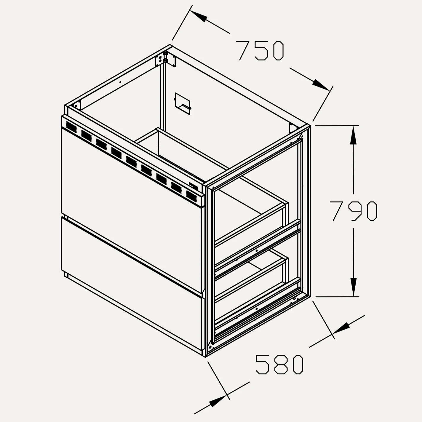 - 2 Ngăn kéo cực đại: Module chia làm 2 tầng ngăn kéo bằng nhau với thành ngăn kéo cao, sâu, tối đa hóa thể tích chứa đồ bên trong khung R750 x S580 (mm).