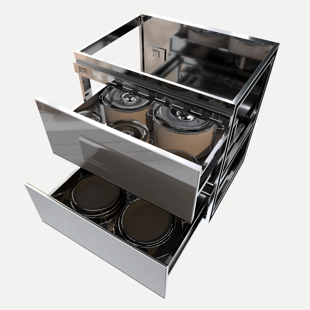 - Vệ sinh ngăn kéo: Chỉ cần lấy xoong nồi ra ngoài, dùng khăn ẩm lau sạch phần đáy Inox. Chất liệu Inox 304 chống bám bẩn nên việc lau chùi rất nhanh chóng.
