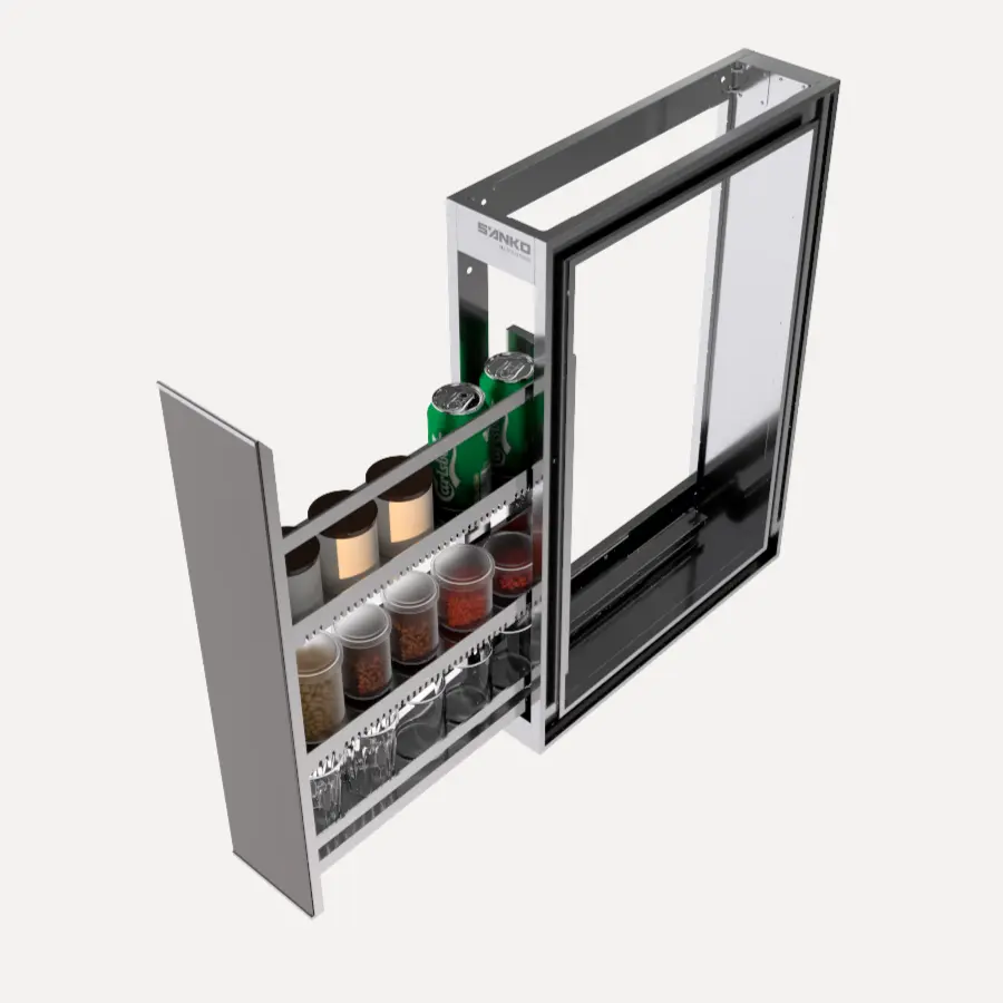 Tủ để ly/gia vị C150LY là một module tủ bếp inox 304 dùng để đựng ly và gia vị, được thiết kế để tối ưu hóa những không gian hẹp trong hệ thống tủ bếp dưới. Với đặc trưng là dạng ngăn kéo dọc thông minh, sản phẩm này giải quyết triệt để vấn đề sắp xếp các chai lọ, gia vị hoặc ly cốc một cách gọn gàng và vệ sinh, tận dụng diện tích tối đa(150mm) trong không gian bếp. Điểm ưu việt của C150LY nằm ở chất liệu inox 304 bền bỉ và khả năng vận hành êm ái.