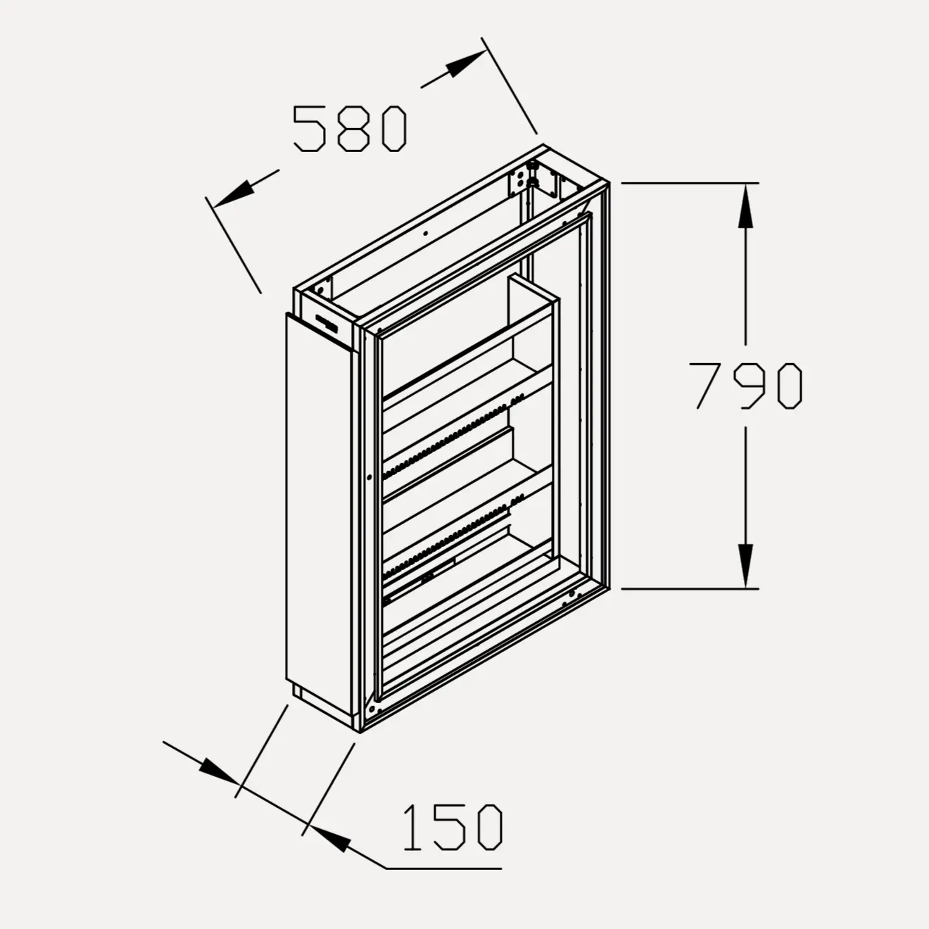 Tủ để ly/gia vị C150LY được cấu tạo dưới dạng một module tủ bếp dưới độc lập và tích hợp trong hệ tủ lớn. Đặc điểm nổi bật nhất là kích thước chiều rộng chỉ 150mm (R. 150), kết hợp với chiều sâu 580mm (S. 580) và chiều cao 790mm (C. 790).