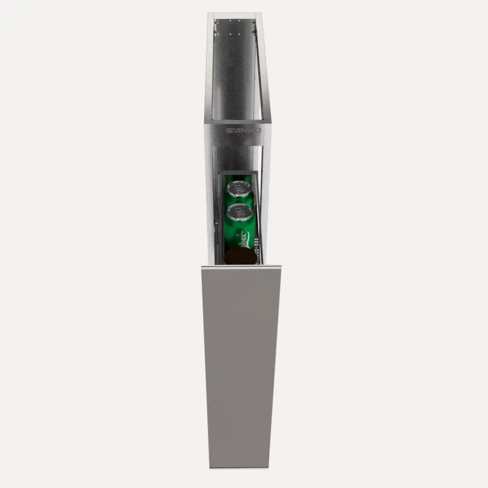 Cấu trúc tủ bao gồm 1 ngăn kéo dọc được gắn trên hệ thống ray trượt giảm chấn. Thùng tủ được chế tạo từ inox 304, cánh tủ đa dạng đáp ứng tổng thể thiết kế nội thất từng khách hàng, đảm bảo sự đồng bộ và thẩm mỹ. Bên trong ngăn kéo được thiết kế các khay, thanh chia ngăn để giữ cố định chai lọ, ly cốc không bị xô lệch khi đóng mở.