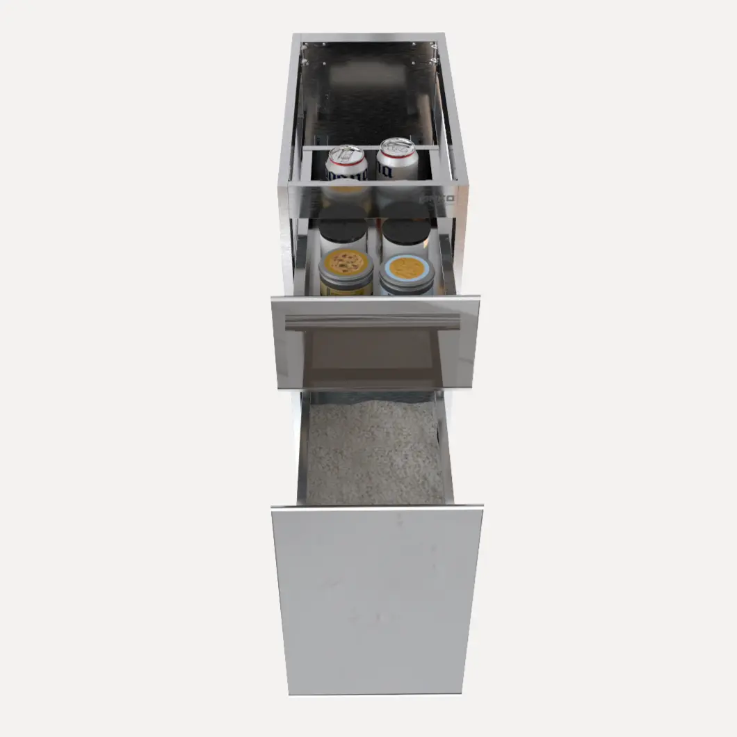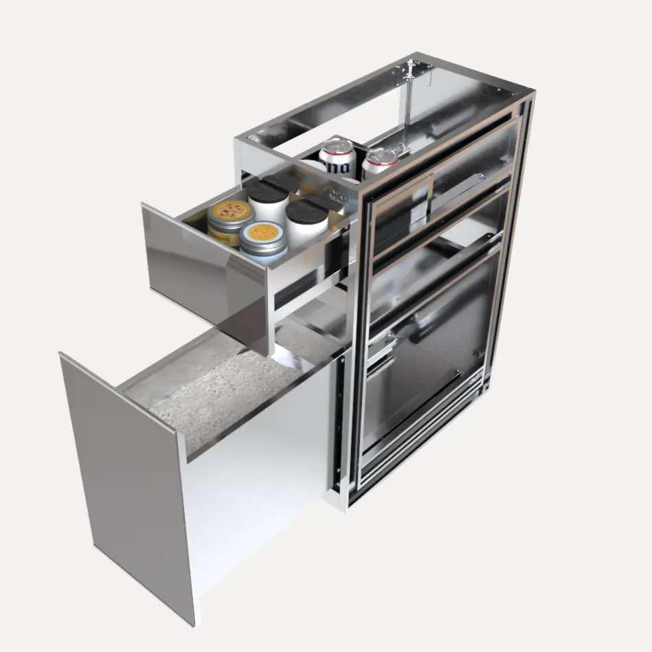 Tủ gạo C300TG là module tủ bếp inox 304 chuyên dùng để bảo quản gạo khỏi ẩm mốc, côn trùng và chuột bọ, được thiết kế âm tủ bếp dưới để tối ưu không gian dưới cao cấp của bếp, mang đến giải pháp bảo quản lương thực đạt chuẩn vệ sinh an toàn thực phẩm cao nhất. Khác với các thùng gạo nhựa thông thường, sản phẩm này tích hợp thùng gạo Inox 304 bền bỉ và một ngăn kéo phụ để gia vị, tất cả gói gọn trong kích thước R.300 – S.580 – C.790 (mm).