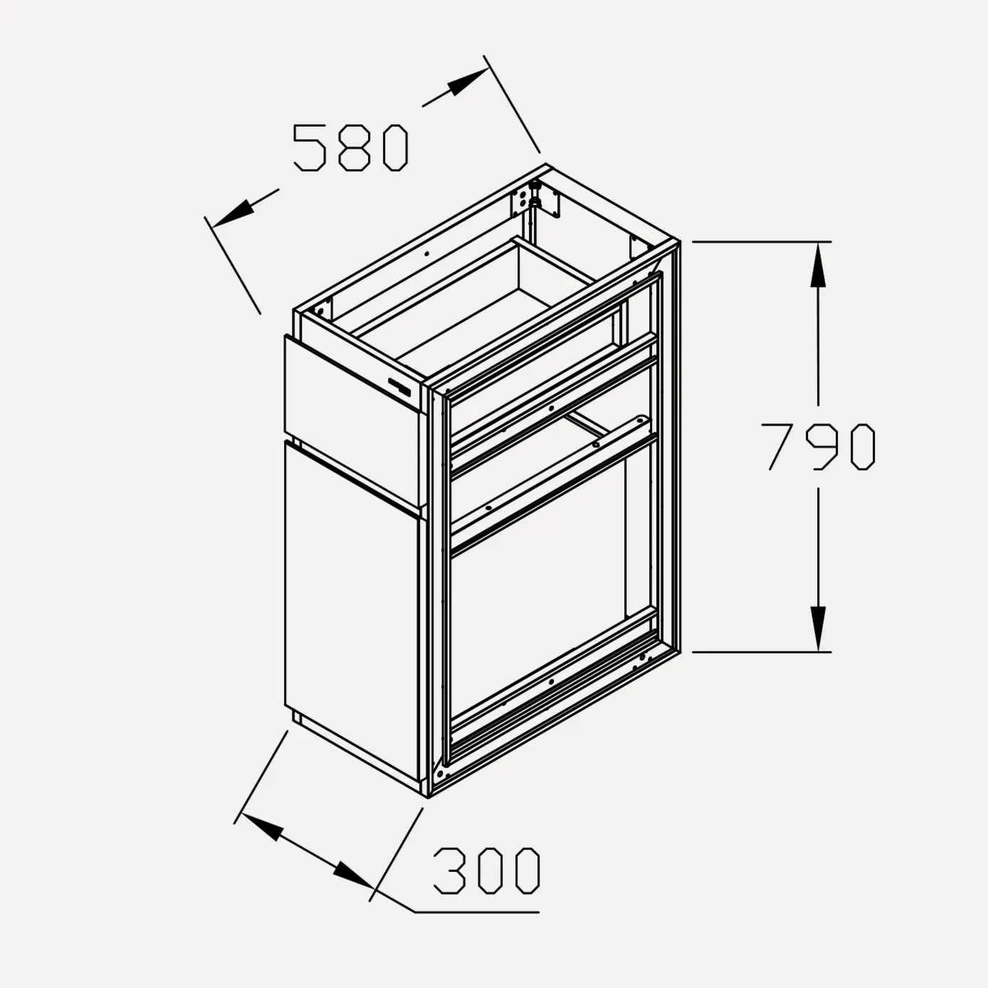 - Kích thước (R x S x C): 300mm x 580mm x 790mm