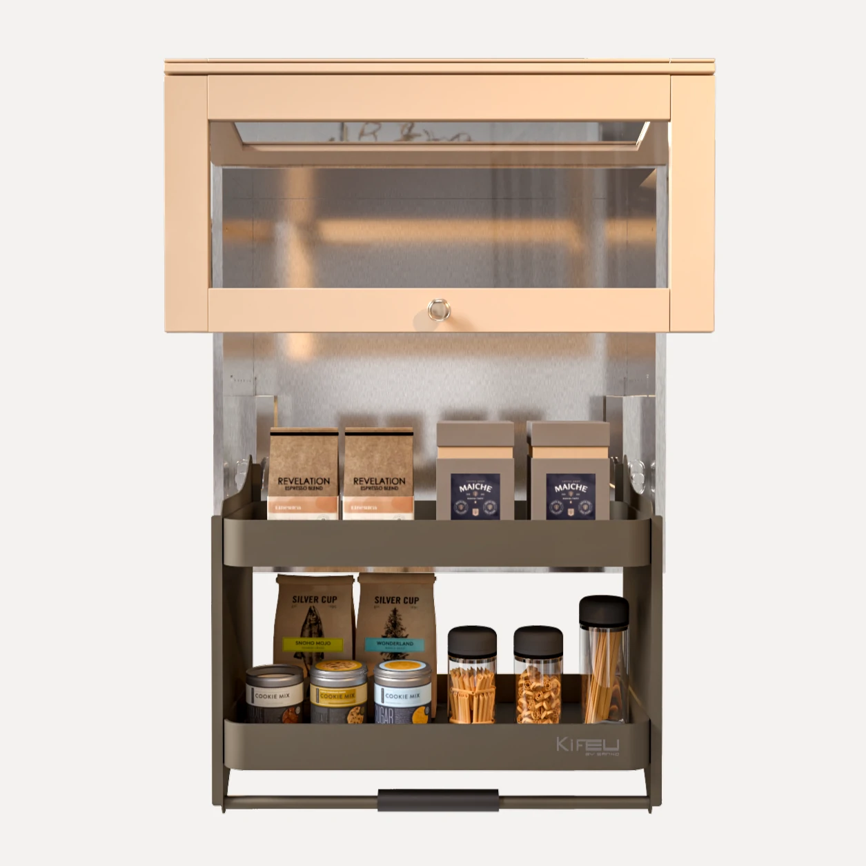 Hệ thống hộp lực của phụ kiện Kifeu được tính toán để nâng đỡ trọng lượng của hàng chục chai lọ thủy tinh mà vẫn giữ được độ mượt mà trong hành trình di chuyển.