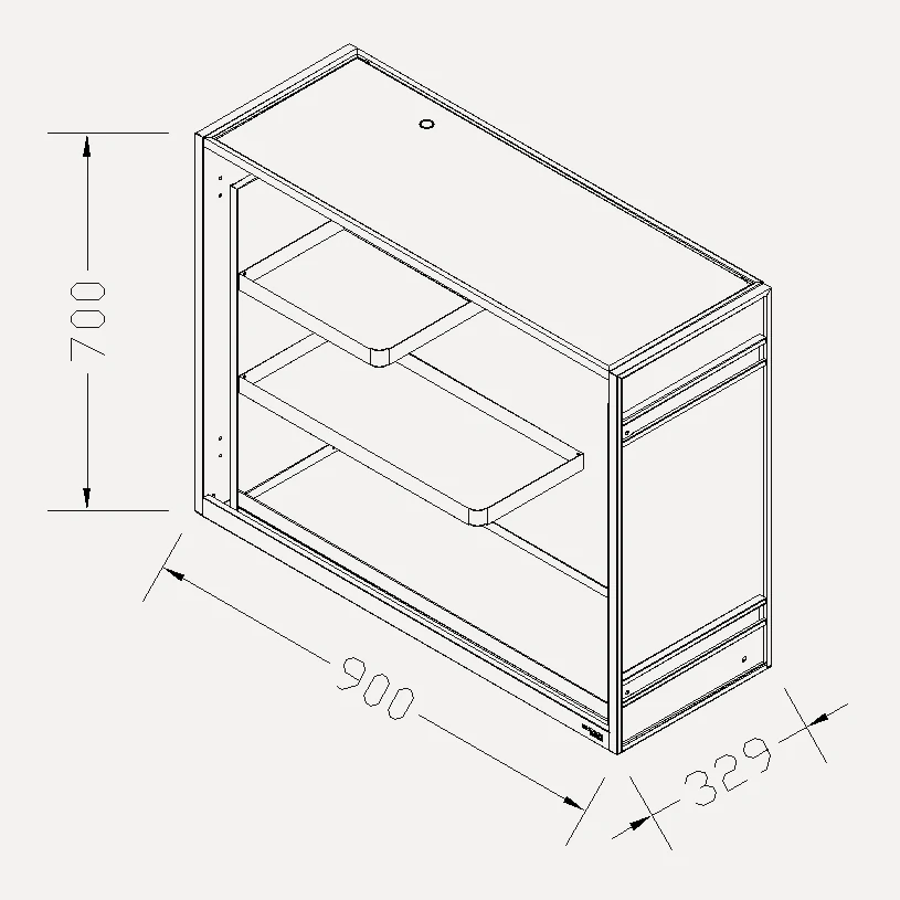 - Module thùng tủ Inox 304: Được gia công chính xác theo kích thước R.900 – S.350 – C.700 mm, đóng vai trò là khung chịu lực vững chắc gắn vào tường.