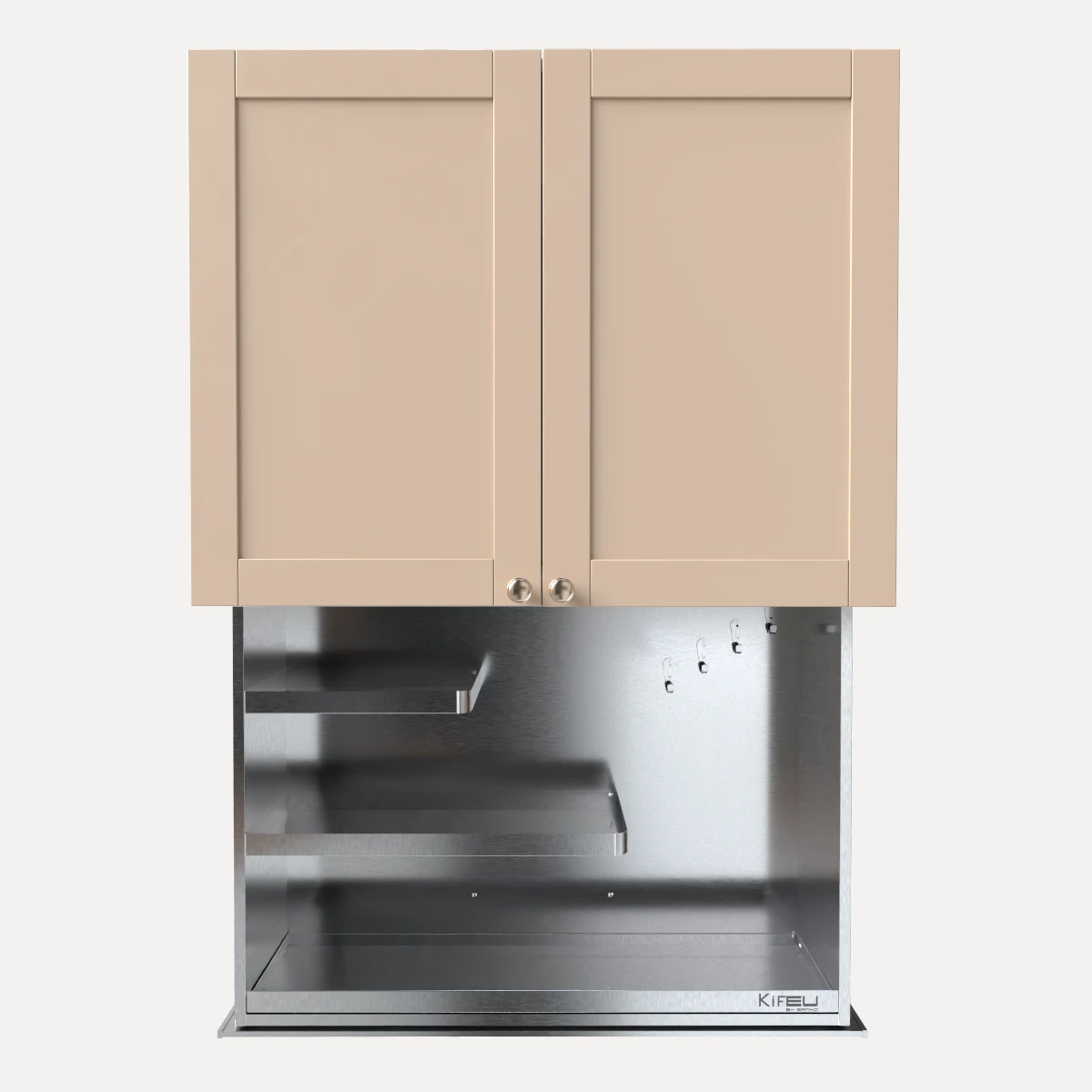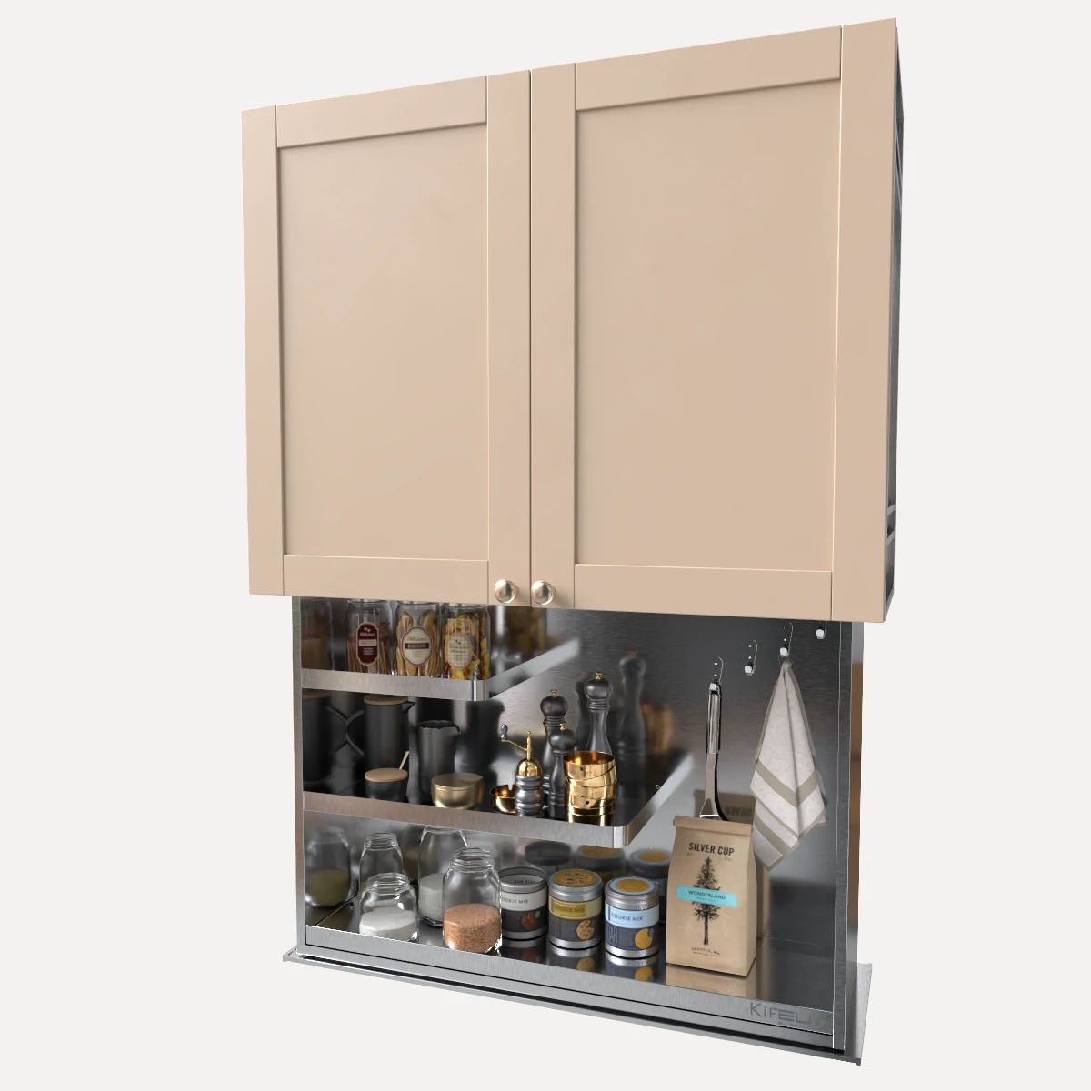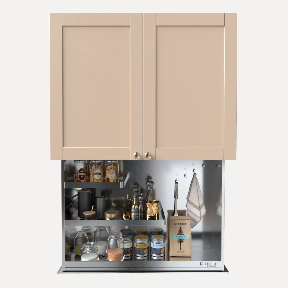 - Lưu trữ thông minh: Sắp xếp gọn gàng các loại chai lọ, hộp gia vị, thực phẩm khô, giúp mặt bếp bên dưới luôn thoáng đãng.