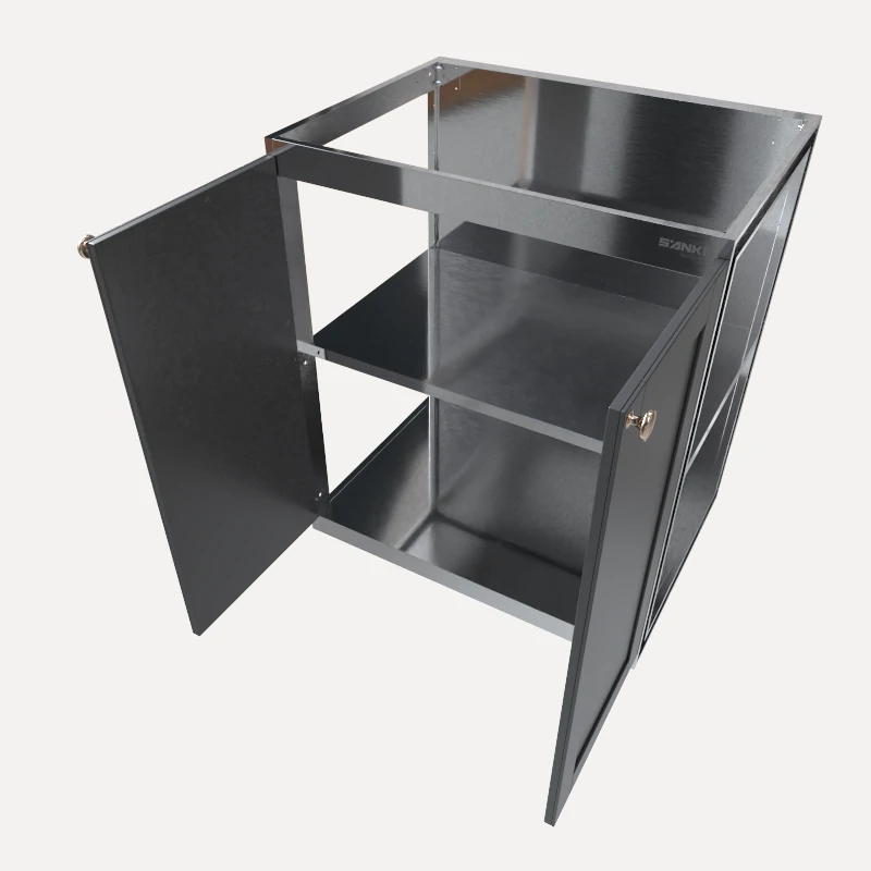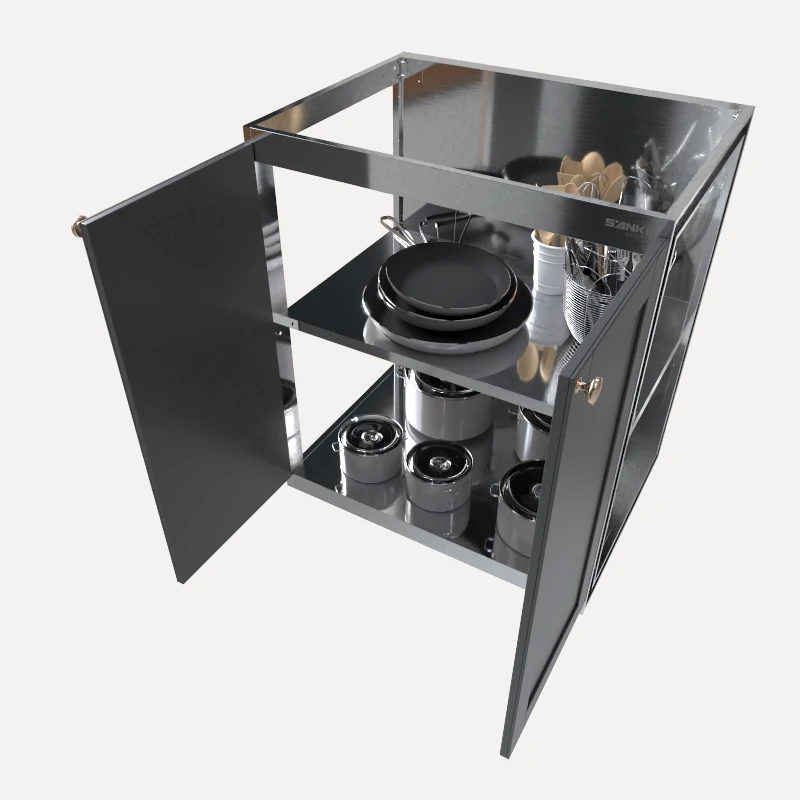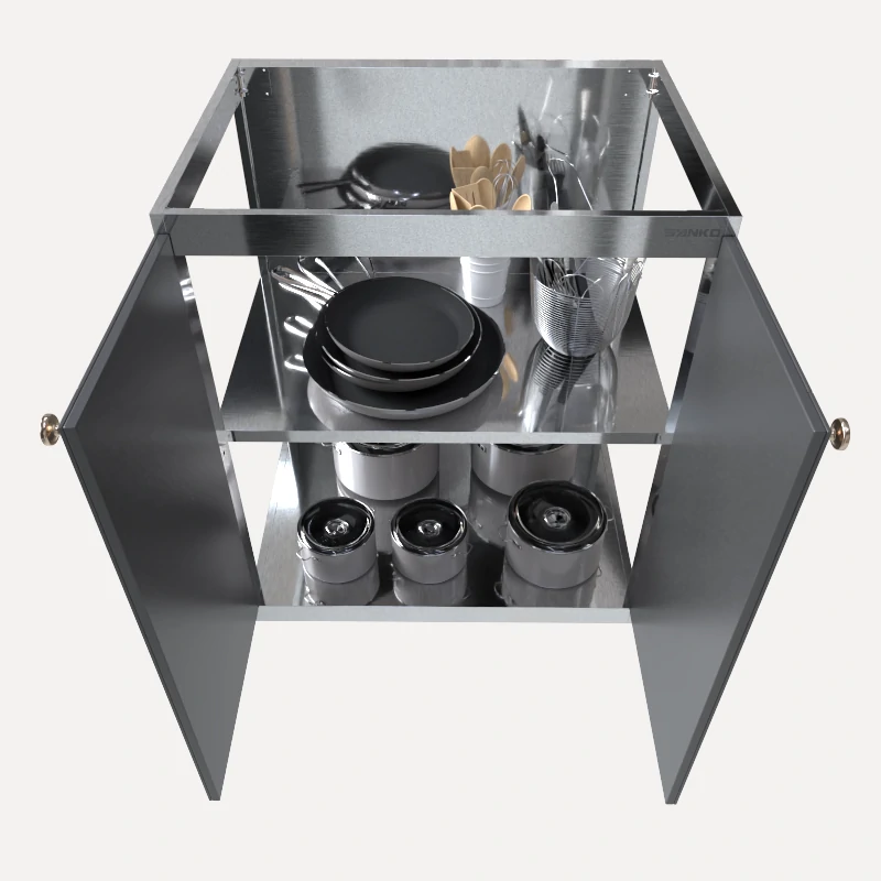 Tủ lưu trữ 2 cánh mở P600CM, P750CM và P900CM là module tủ bếp inox 304 dưới chuyên dụng làm từ 100% Inox 304, có thiết kế 2 cánh mở kết hợp đợt chia tầng nhằm lưu trữ trực tiếp các thiết bị, xoong nồi ngoại cỡ và thực phẩm khô khối lượng lớn.